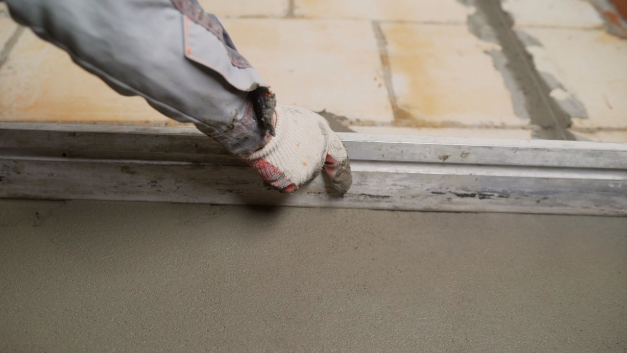 - Укладка – выставить маяки, не превышать воду затворения; разравнивать правилом, по возможности использовать виброрейку.