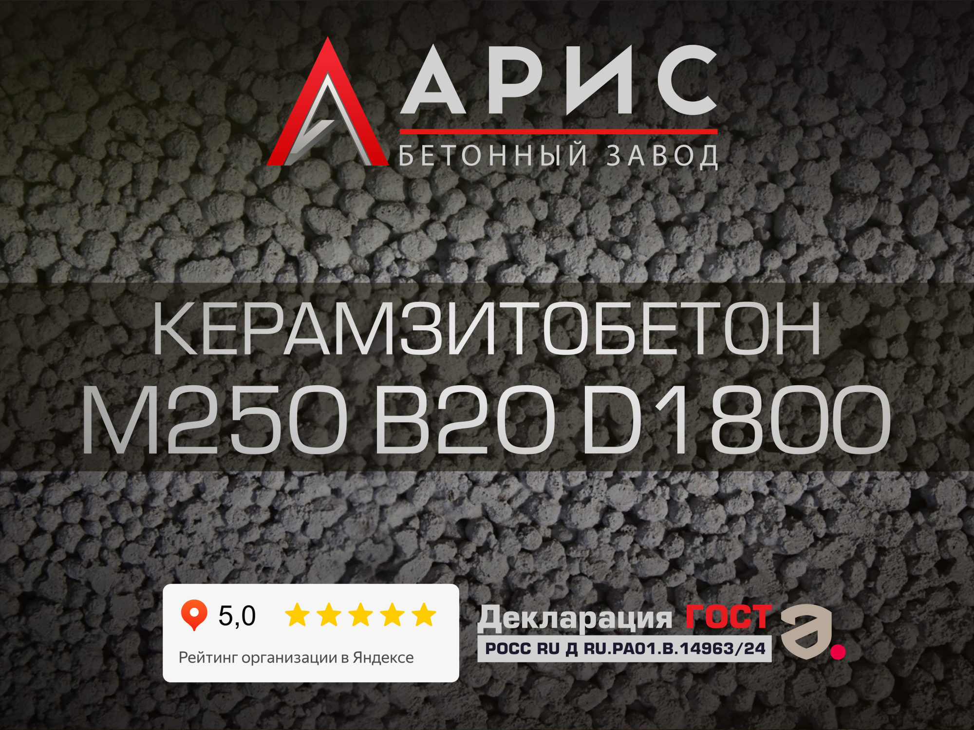 Керамзитобетон М250 B20 F150 W4 D1800 – конструкционный лёгкий материал для конструкций, где важны снижение собственного веса и достаточный запас несущей способности. Производство ведёт бетонный завод «Арис» в Можайске по основному стандарту ГОСТ 25820–2014, а требования к свежей смеси и операционному контролю выполняются по ГОСТ 7473–2010. Каждая партия сопровождается картой подбора и протоколами лаборатории.