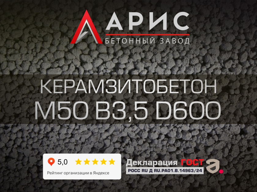 Керамзитобетон D600 – лёгкий конструкционно-теплоизоляционный материал для слоёв и элементов, где важны низкая масса и устойчивые теплотехнические свойства. Производство ведёт бетонный завод «Арис» в Можайске по основному стандарту ГОСТ 25820–2014; требования к свежей смеси и её поставке выполняются по ГОСТ 7473–2010. Каждая партия выпускается по карте подбора и сопровождается протоколами лаборатории.