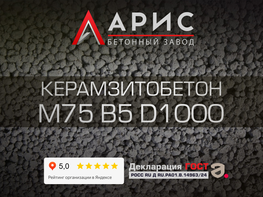 Керамзитобетон М75 B5 F100 W4 D1000 – лёгкий бетон для энергоэффективных и облегчённых конструкций в Можайске. Производство ведёт бетонный завод «Арис» по основному стандарту ГОСТ 25820–2014 (лёгкие бетоны); требования к поставке и контролю свежей смеси – по ГОСТ 7473–2010.